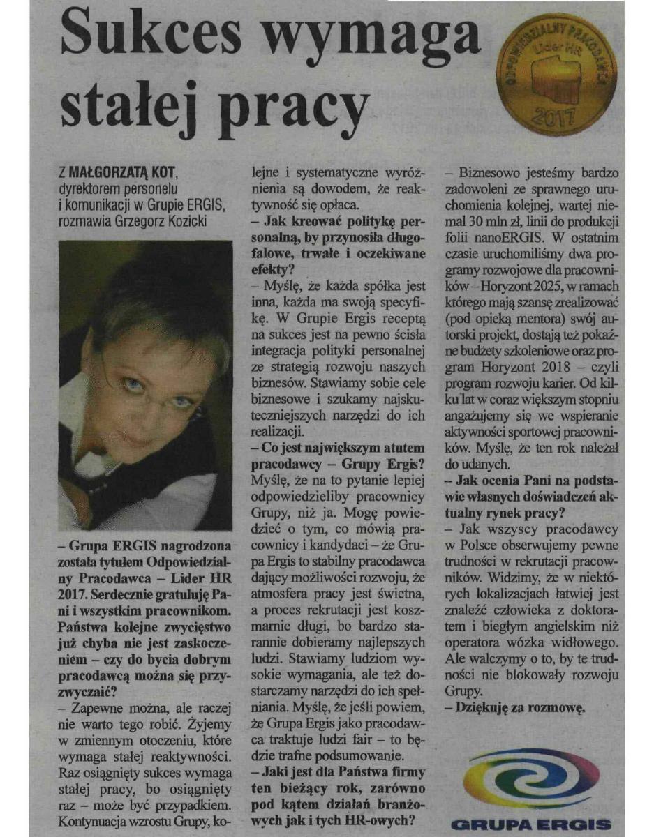 Publikacja, w której zawarta jest autoryzowana rozmowa z Małgorzatą Kot, Dyrektorem personelu i Komunikacji w Grupie Ergis. Rozmowa była przeprowadzona na temat pracodawcy, jakim jest Grupa Ergis, pod kątem aktualnego rynku pracy oraz spojrzenia biznesowego i HR-owego wewnątrz firmy. W artykule wspomniano również o otrzymaniu przez Grupę Ergis nagrody pt. Pracodawca – Lider HR 2017.