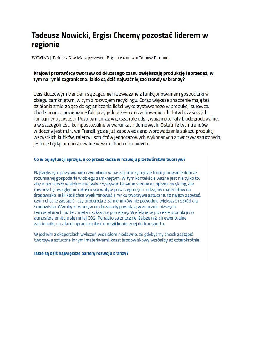 - parkiet.com Tadeusz Nowicki, Ergis: Chcemy pozostać liderem w regionie (cały tekst wywiadu tutaj)