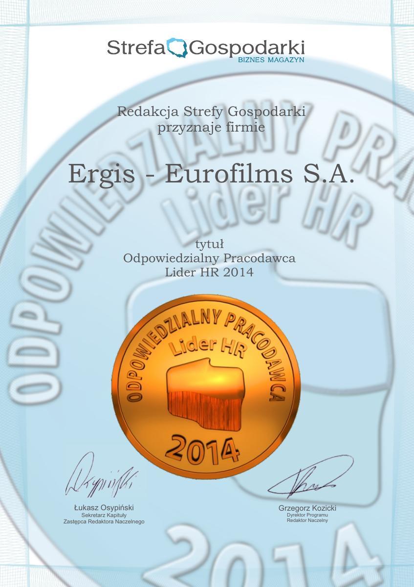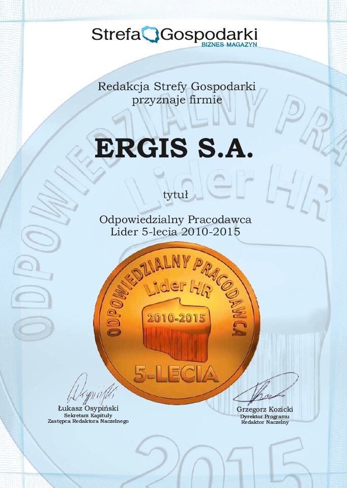 It is our pleasure to inform you that the ERGIS GROUP has been awarded, for the second time, a prestigious “CSR Silver Leaf” award of the Polityka magazine, which covers seven areas most important for the CSR, namely:corporate governance, human rights, conduct towards employees, environmental protection, customer care, business integrity and social commitment.