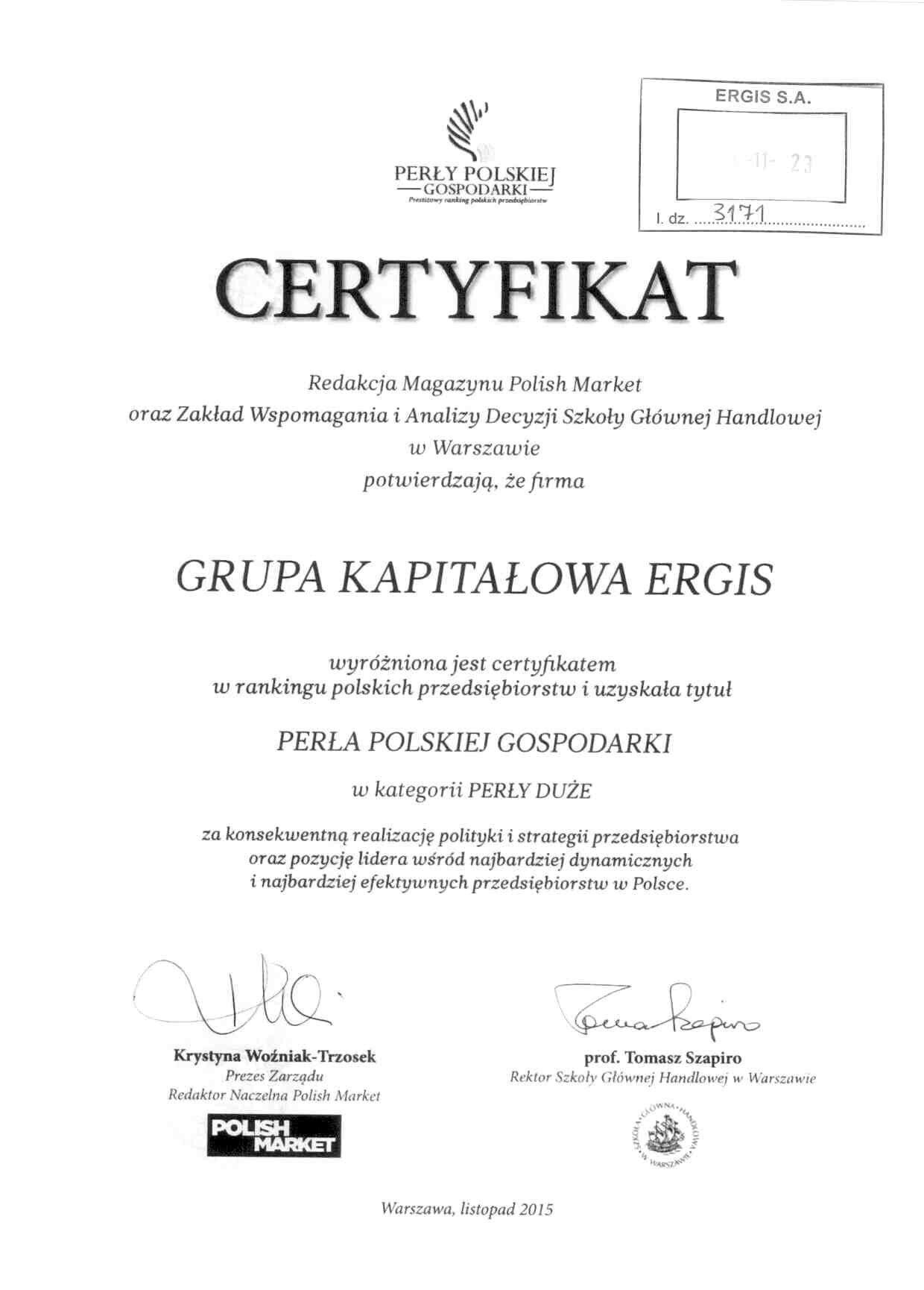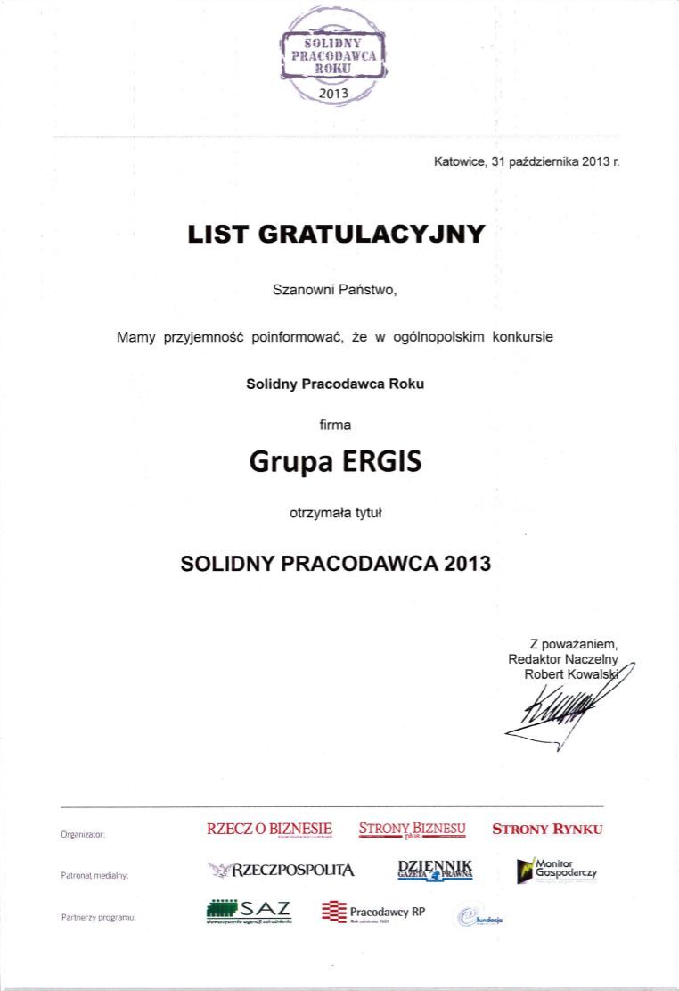 We are pleased to announce that the ERGIS GROUP has been awarded the title of “Reliable Employer of 2013” in the category for Polish employers. The contest has been organised by Media Group Partner under the patronage of the "Rzeczpospolita" daily and the "Gazeta Prawna" daily. It takes into consideration working conditions, punctuality in paying employee remuneration, a remuneration system, training courses and solutions concerning HR policy. This is a great honour for us. All the more so as the interviews with the GROUP's employees played a critical role in choosing the winner. It is our another accolade – in 2011 and 2012 we were awarded the title of “Responsible Employer", and in 2007 and 2013 - the title of “Reliable Employer". Promoting the best models in personnel policy has always been an issue of special importance for us. We are glad that our endeavours for employees’ development and best possible work conditions have been again appreciated and honoured.