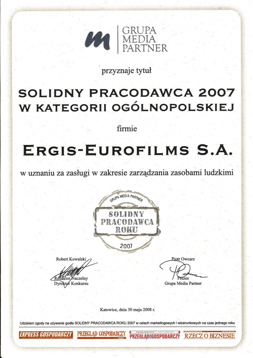 We are pleased to announce that Ergis Group has been awarded the title “Reliable Employer" in the category for Polish. The contest has been organised by Media Group Partner under the patronage of the "Rzeczpospolita" daily and the "Gazeta Prawna" daily. The criteria of the contest were working conditions, punctuality in paying employee remuneration, a remuneration system, training courses and solutions concerning HR policy.