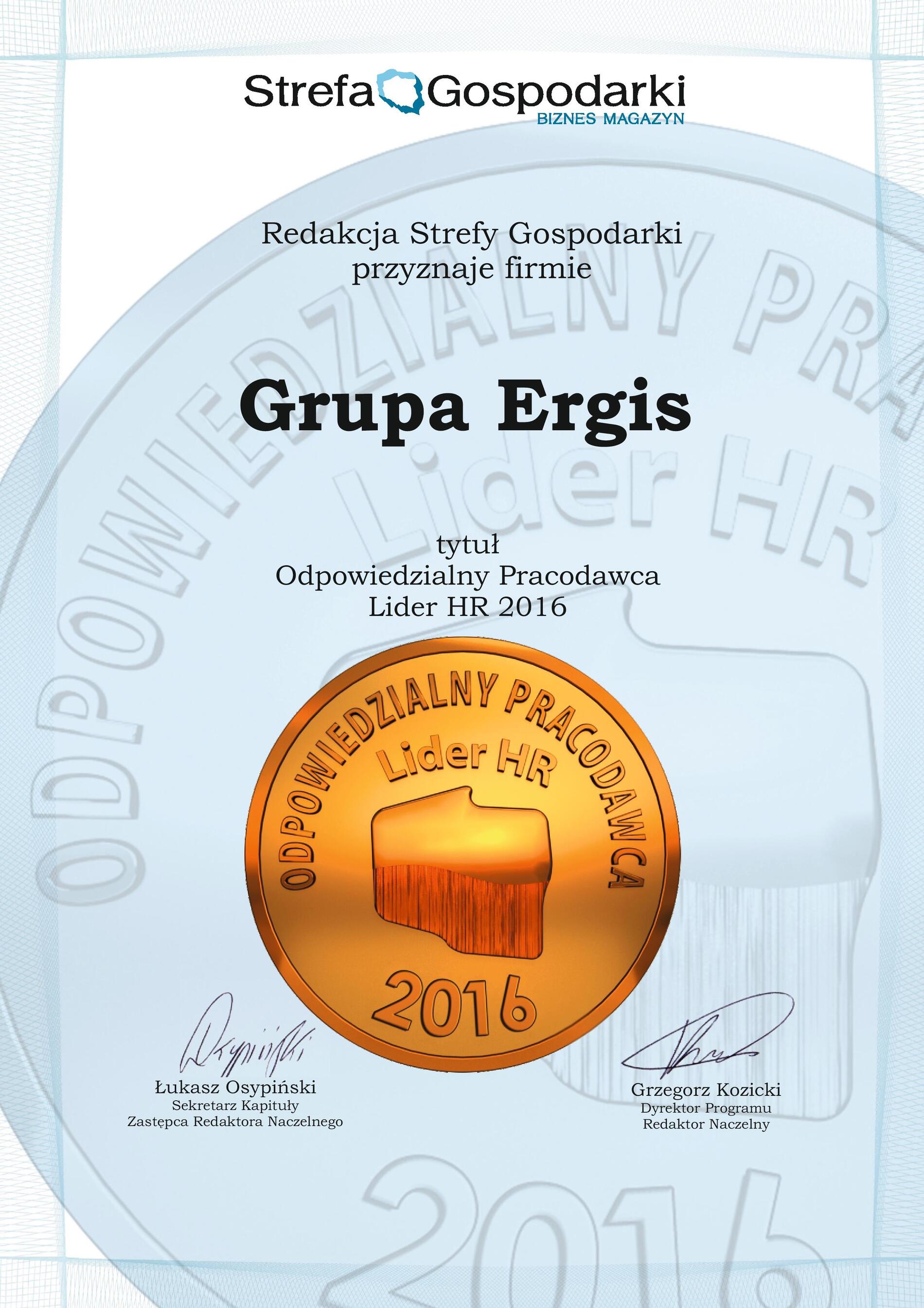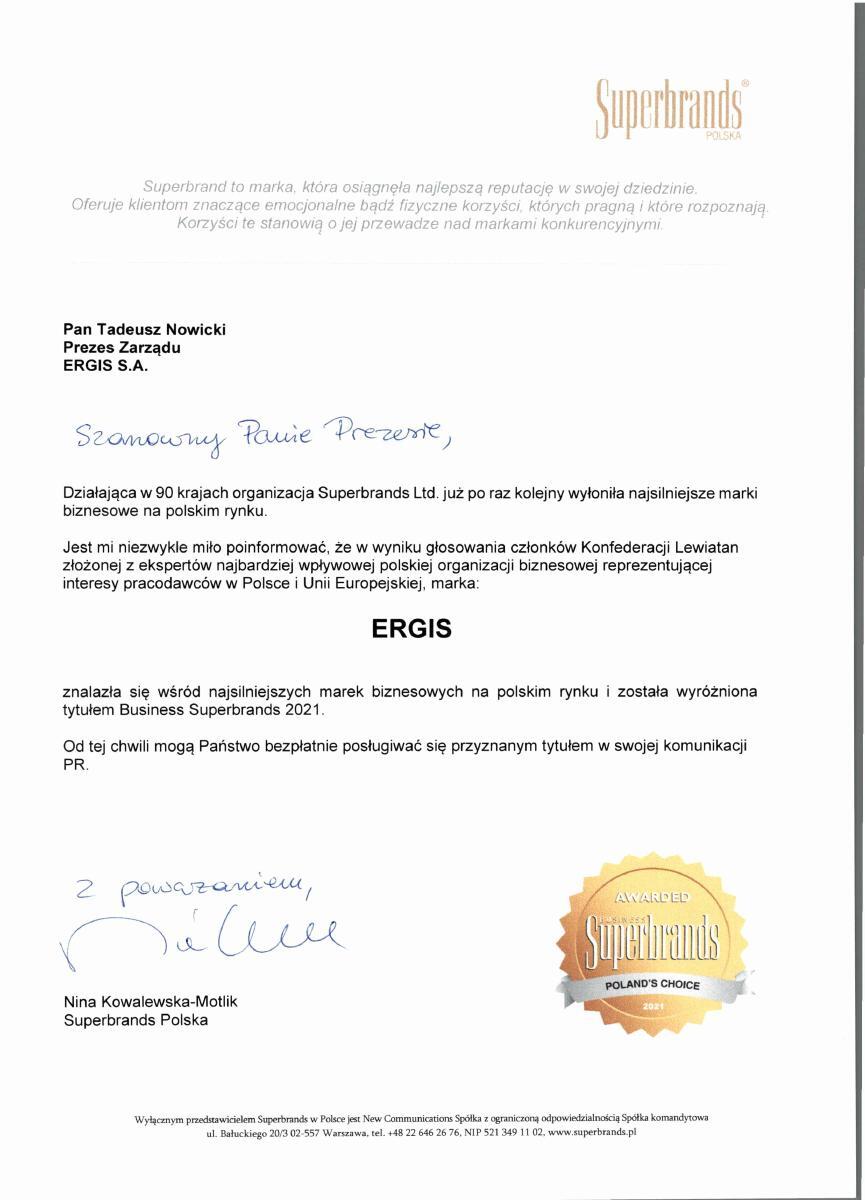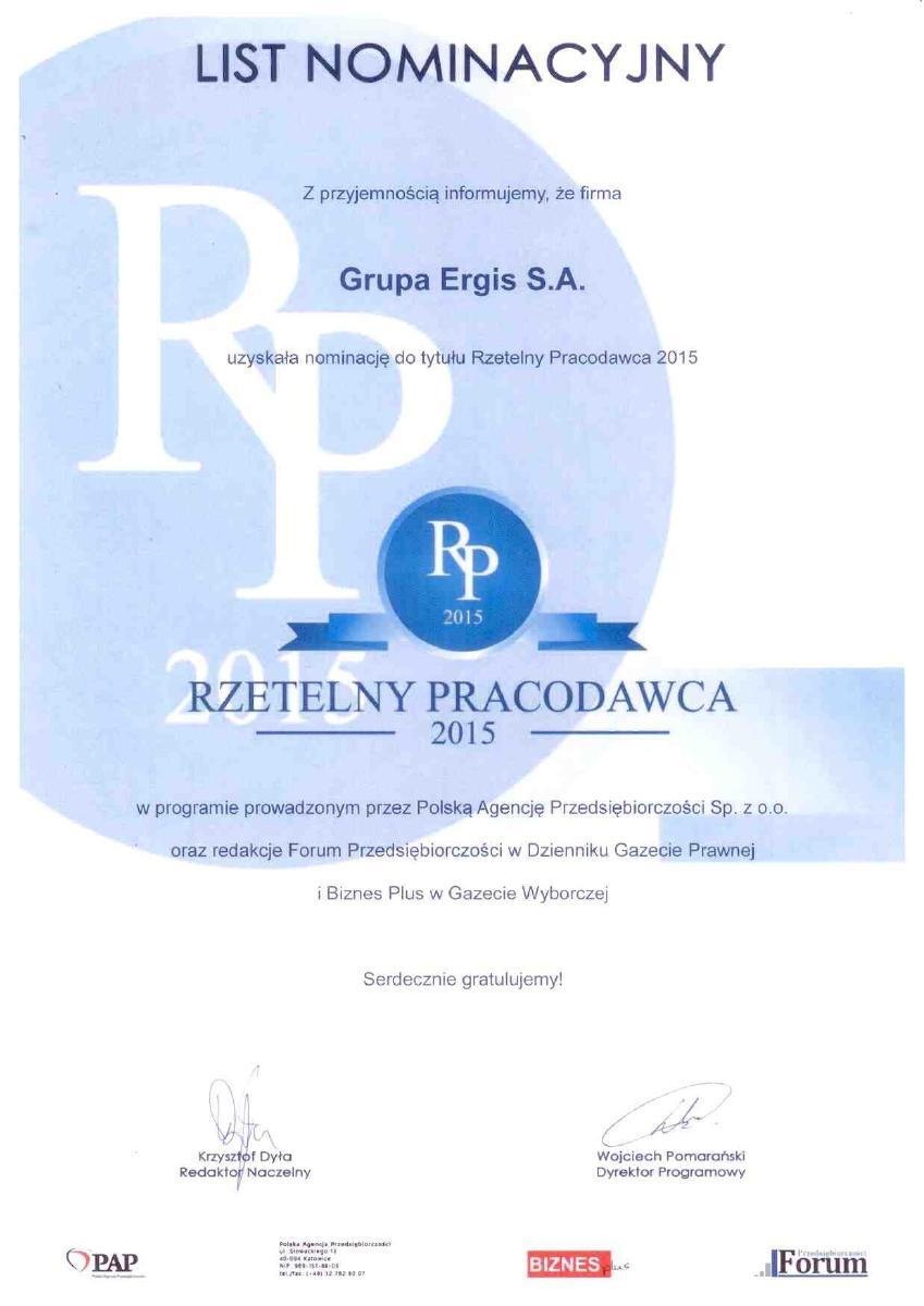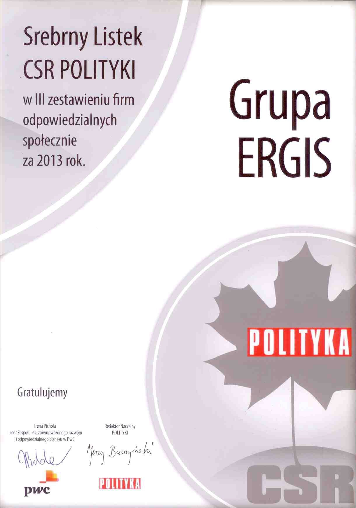Employeur Solide 2013 au niveau national. Il s'agit d'une compétition organisée par le Media Group Partner sous le patronat des journaux « Rzeczpospolita » i « Gazeta Prawna ». Dans la compétition, le jury prend en considération les conditions du travail, la solidité au paiement des salaires et la politique de l'emploi. La distinction est d'autant plus importante que l'appréciation du jury est faite sur la base des interviews avec les employés de toutes les divisions de la Société Ergis SA.