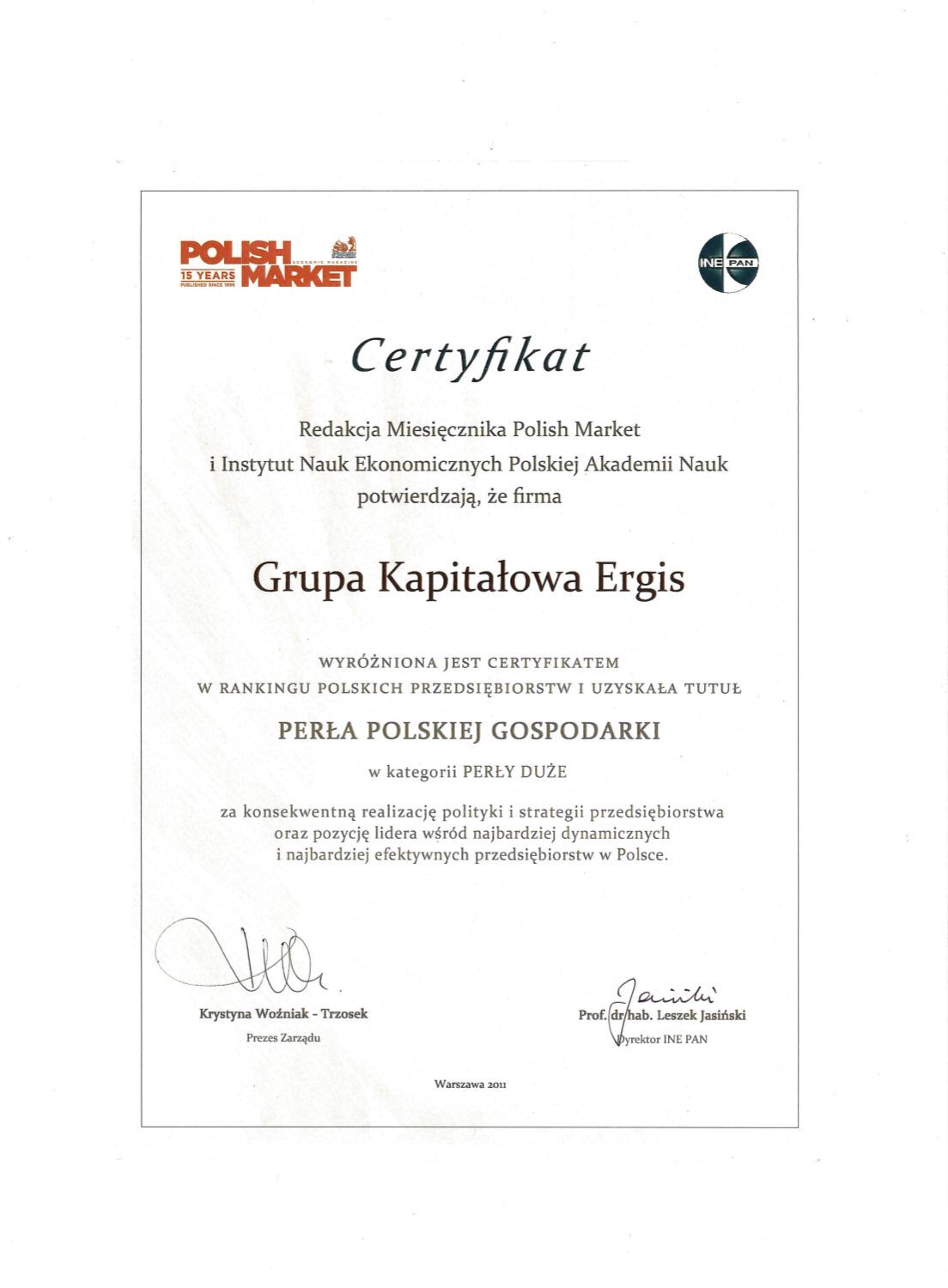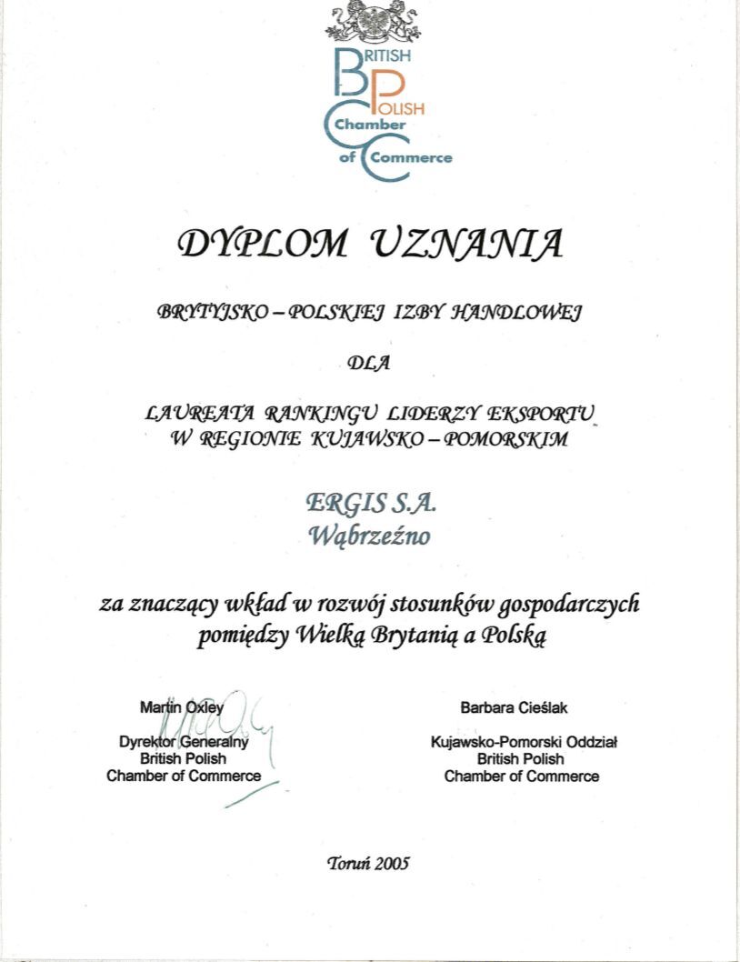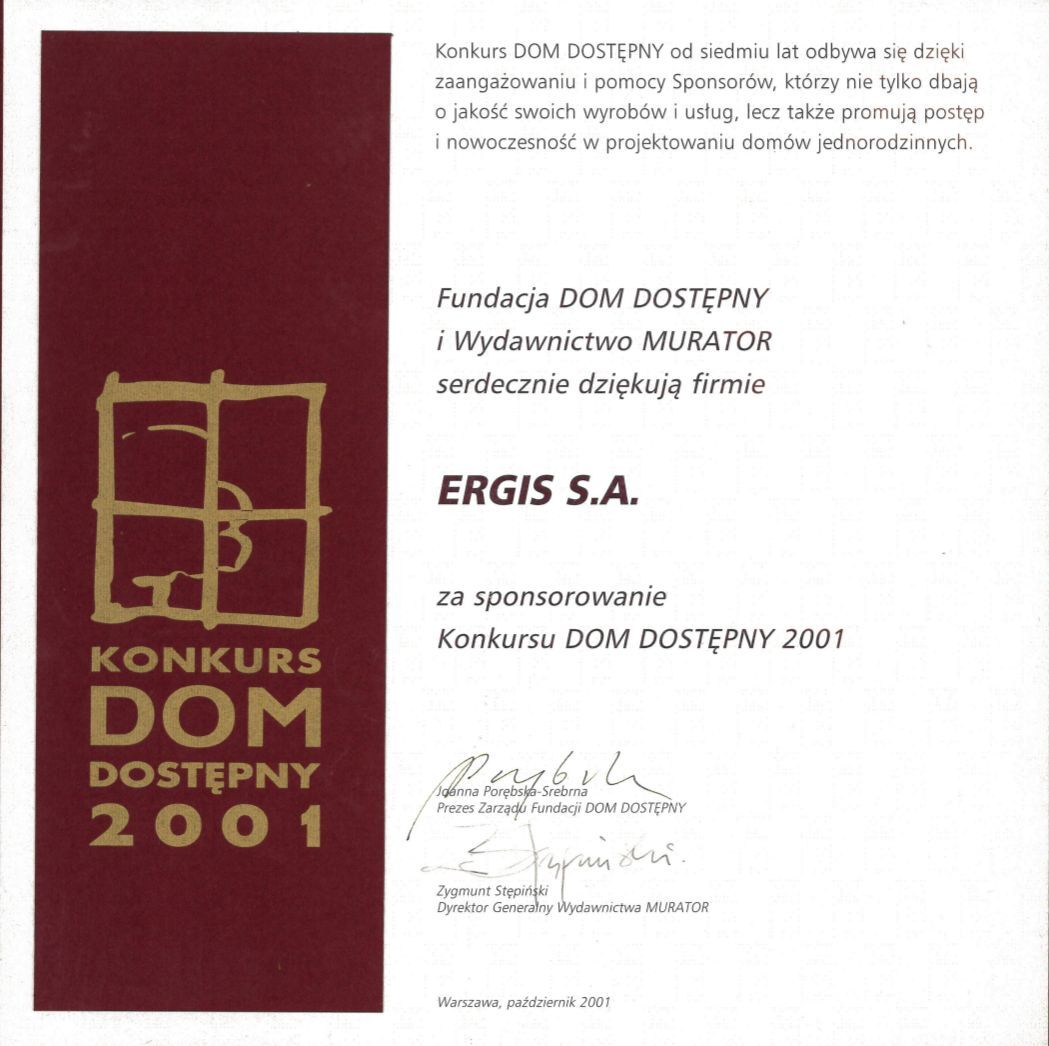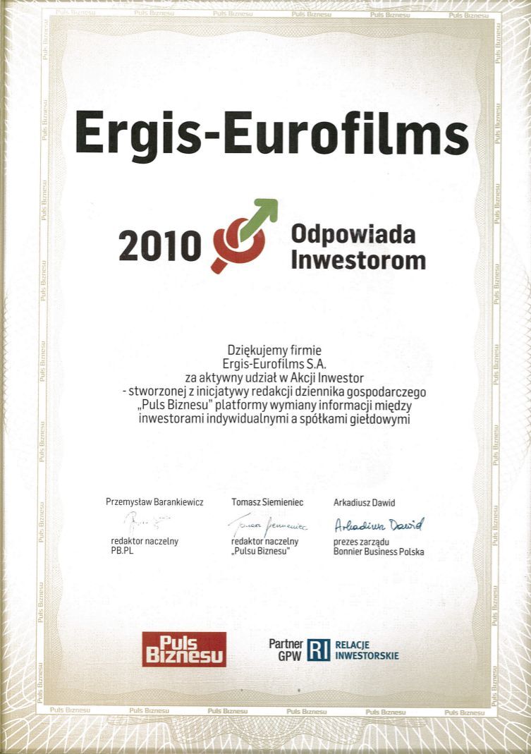 Employeur Solide 2013 au niveau national. Il s'agit d'une compétition organisée par le Media Group Partner sous le patronat des journaux « Rzeczpospolita » i « Gazeta Prawna ». Dans la compétition, le jury prend en considération les conditions du travail, la solidité au paiement des salaires et la politique de l'emploi. La distinction est d'autant plus importante que l'appréciation du jury est faite sur la base des interviews avec les employés de toutes les divisions de la Société Ergis SA.